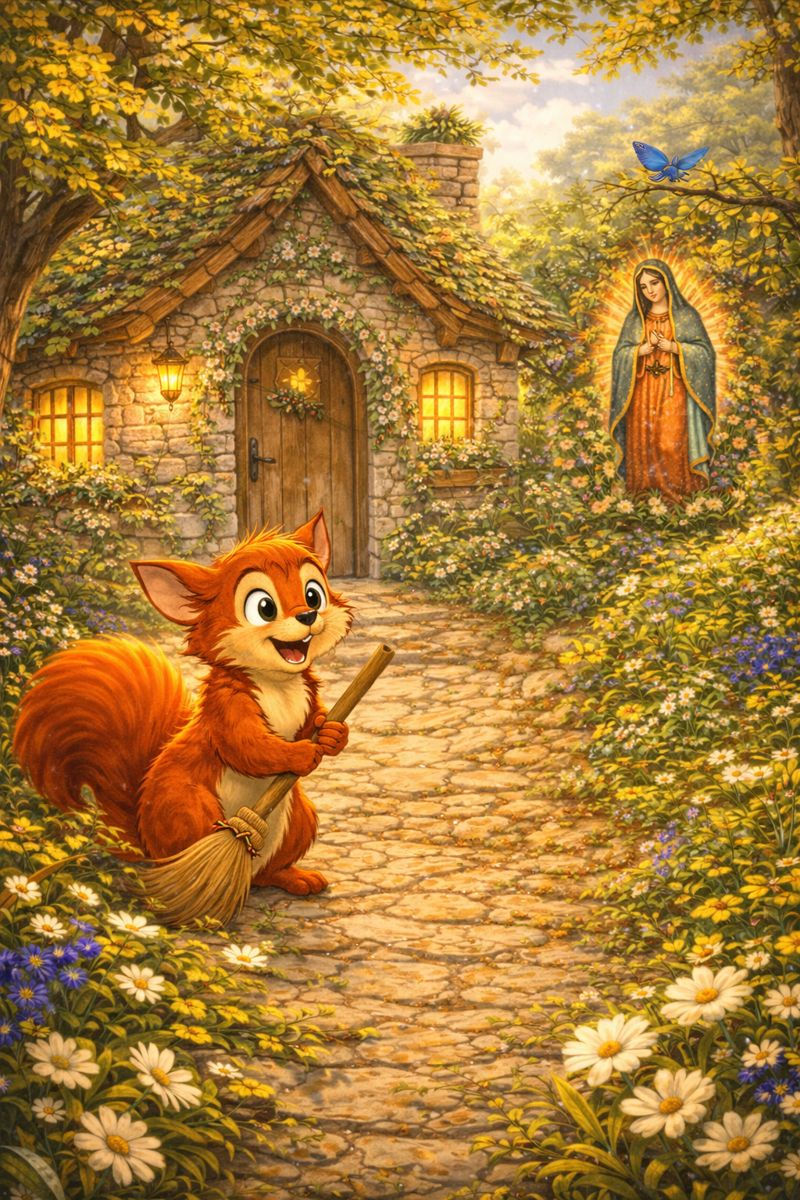 Con el corazón lleno de dolor y angustia, nuestro protagonista ardilla subió a un árbol. Allí vio una hoja con la imagen de la Virgen de Guadalupe. Roja Hoja recordó haber visto episodios de La Rosa de Guadalupe por las ventanas de las casas de los seres humanos de su barrio. Comenzó a rezarle a la imagen de la hoja. Cuando terminó su oración, apareció una rosa blanca.